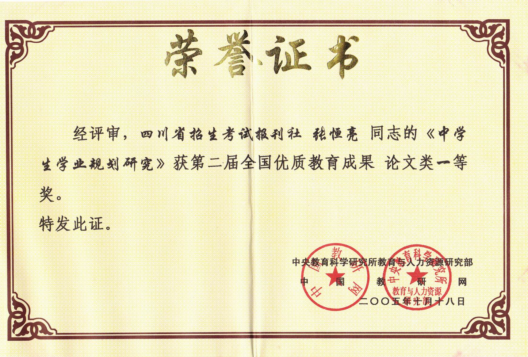 2005年明略首席专家张恒亮老师参加中央教科所人力与教育资源部举办的教育研究成果评比获得的奖项。